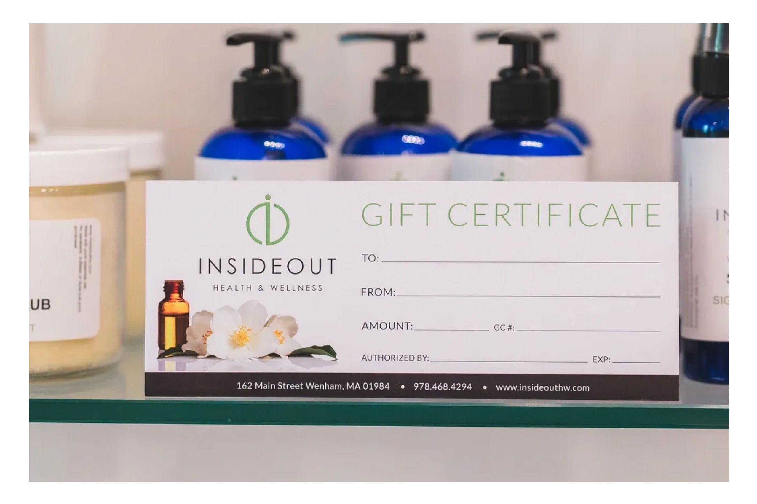 Surprise someone special with a gift card from Insideout Health & Wellness. Perfect for any occasion, our gift cards offer a chance to unwind and rejuvenate with our massage therapy services.